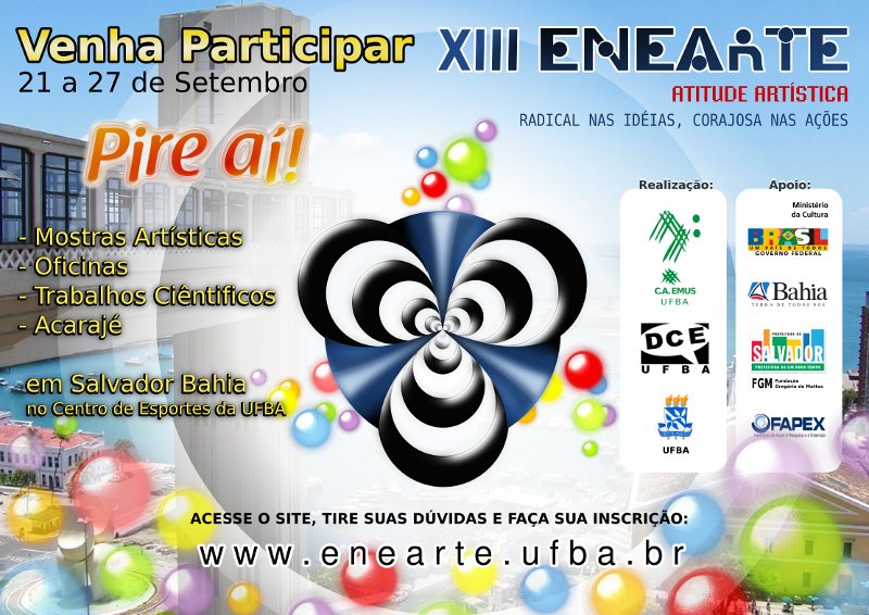 < < | Você pode colaborar na divulgação utilizando algum material aqui existente ou criando novas peças e enviando para nós! Participe, pegue aqui a logo do evento e crie uma peça e mostre sua atitude divulgando o XIII ENEARTE. | |||||||