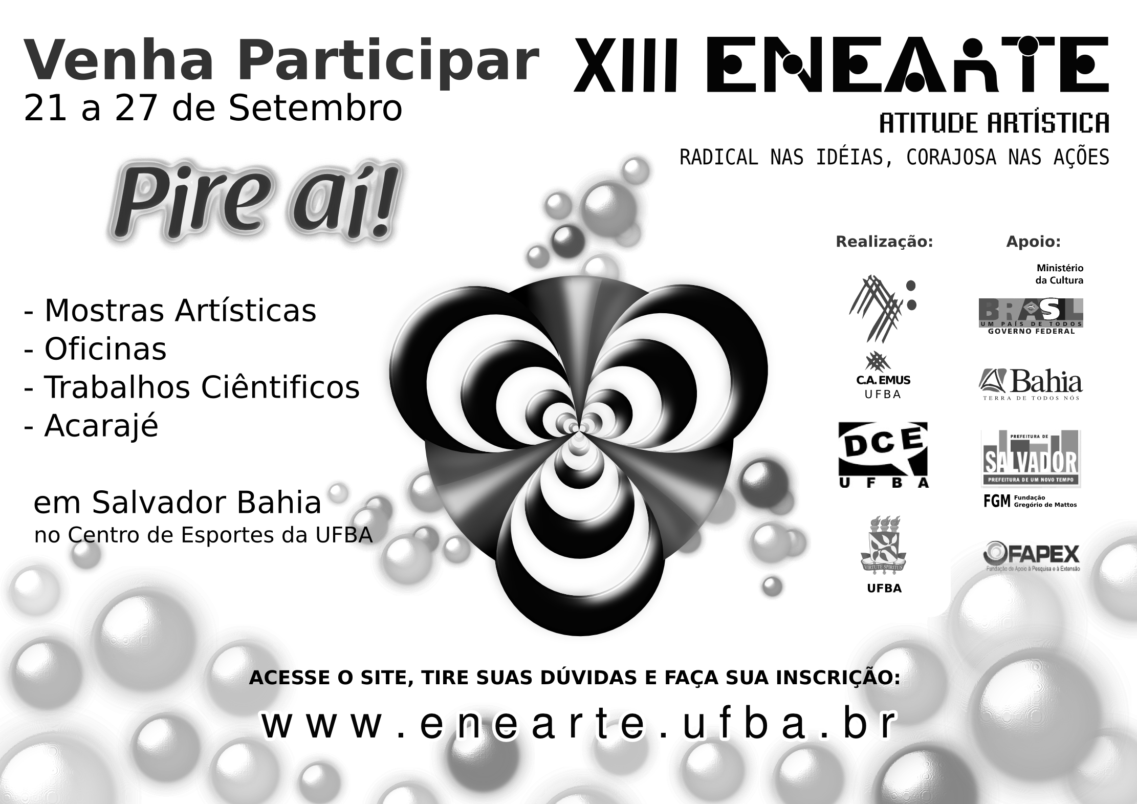 Colabore na DivulgaçãoVocê pode colaborar na divulgação utilizando algum material aqui existente ou criando novas peças e enviando para nós! Participe, pegue aqui a logo do evento e crie uma peça e mostre sua atitude divulgando o XIII ENEARTE.Cartaz Digital e para Impressão![]()